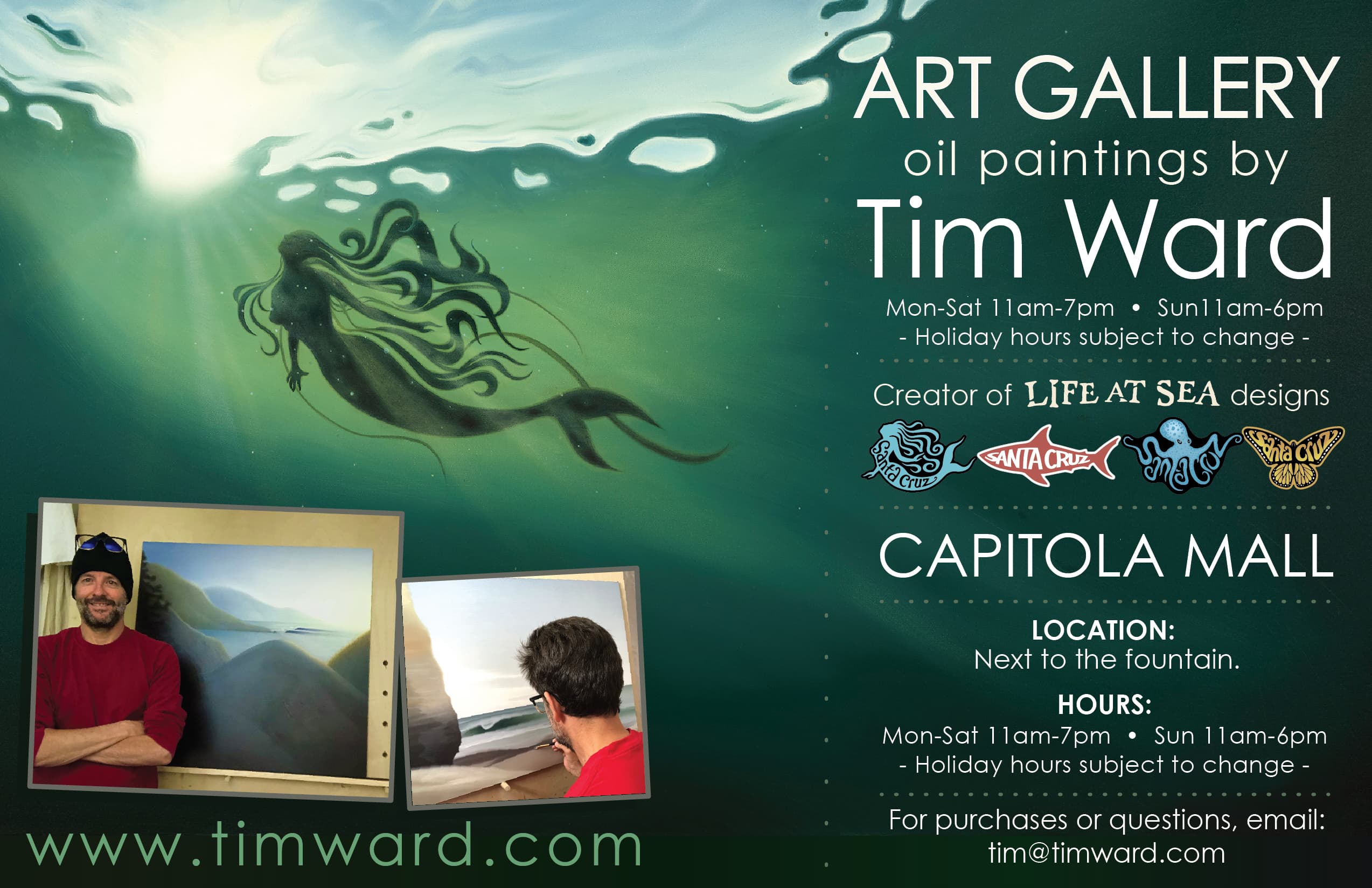 Other than Jim Phillips, who designed the ubiquitous Classic Dot logo for Santa Cruz Skateboards, you’d be hard pressed to find another artist with as much of their designs out and about in public than Tim Ward. It seems like every other car on the road has one of Ward’s “Life at Sea” bumper stickers on display, with notable designs that portray mermaids, sea otters, butterflies, and sea turtles.