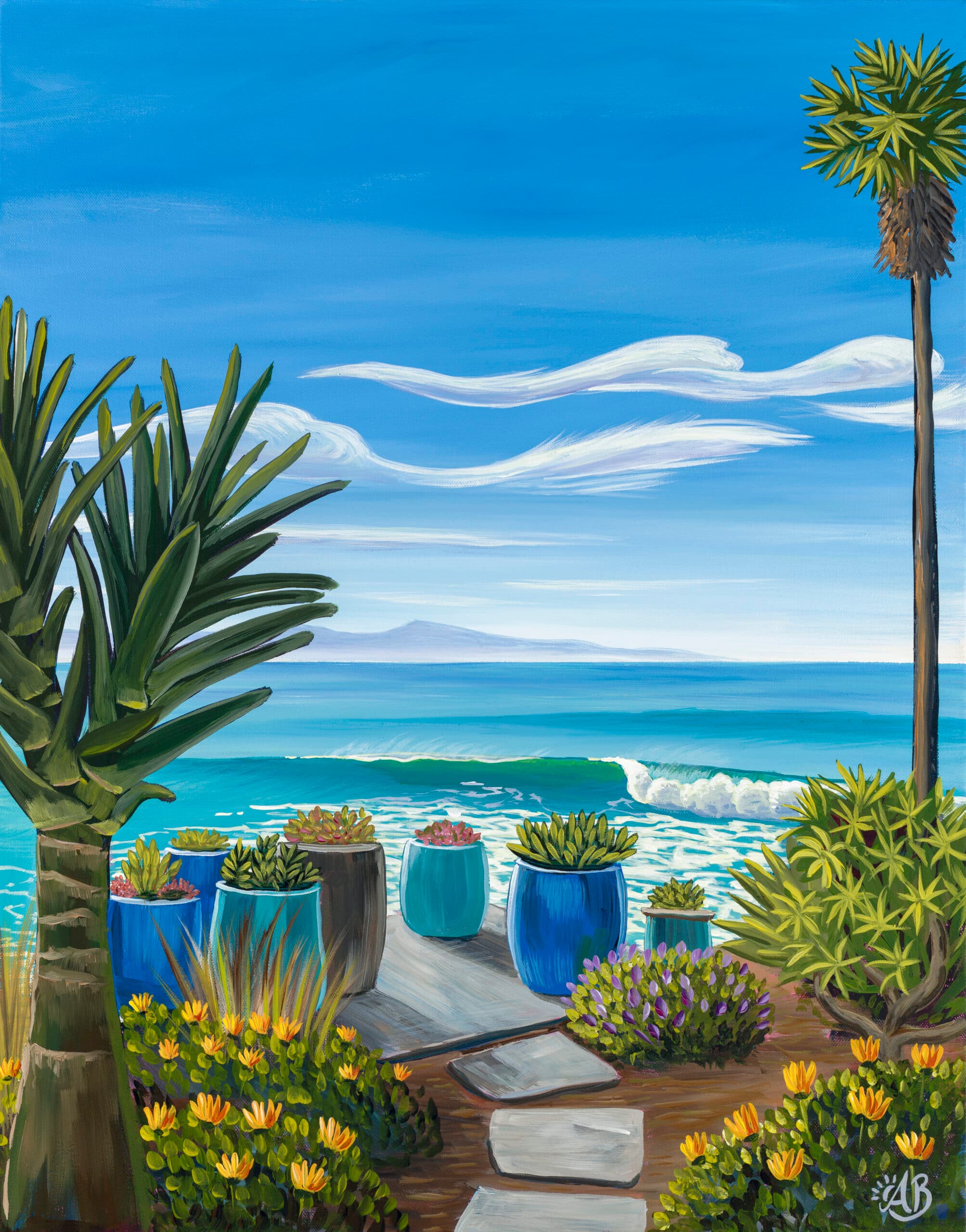 This piece was inspired by a favorite little window in my neighborhood. Down at the end of Rockview Drive is a viewpoint out to the Pleasure Point surf breaks and bay beyond. I often head here to begin my surf checks. There is a private residence right on the cliff with this enchanting garden of potted succulents. My mind drifts away and I imagine myself waking up to this view, coffee in hand as the sun warms me up, and perfect little waves send a playful invitation.