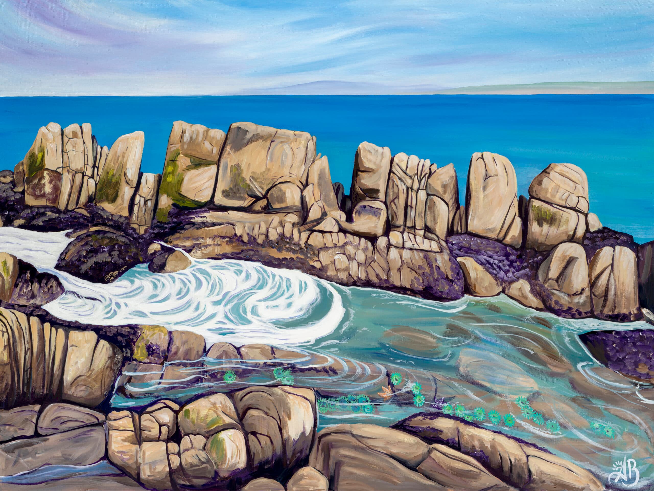 This collection of paintings was born from photos I have taken over the years, during various moments enjoying this stretch of coastline. Some ideas I hang on to for years before I paint them, but this one was a spontaneous inspiration. As it turns out, just this past winter I was on a mini-adventure to Pacific Grove to visit the Art Center and my soon-to-be-inhabited gallery space. With my daughter & Neal, we trekked down to Lover’s Point to take in the view and climb on the rocks. I liked the composition of the prominent rock formations sheltering a crystal clear pool, as a wave washes through a space between. My paintings often have a little adventure or memory attached to them, I love being transported back through the process. Every viewer might have their own memories that are stirred up by these paintings, and I find it so special to hear the stories that connect my audience to my art.