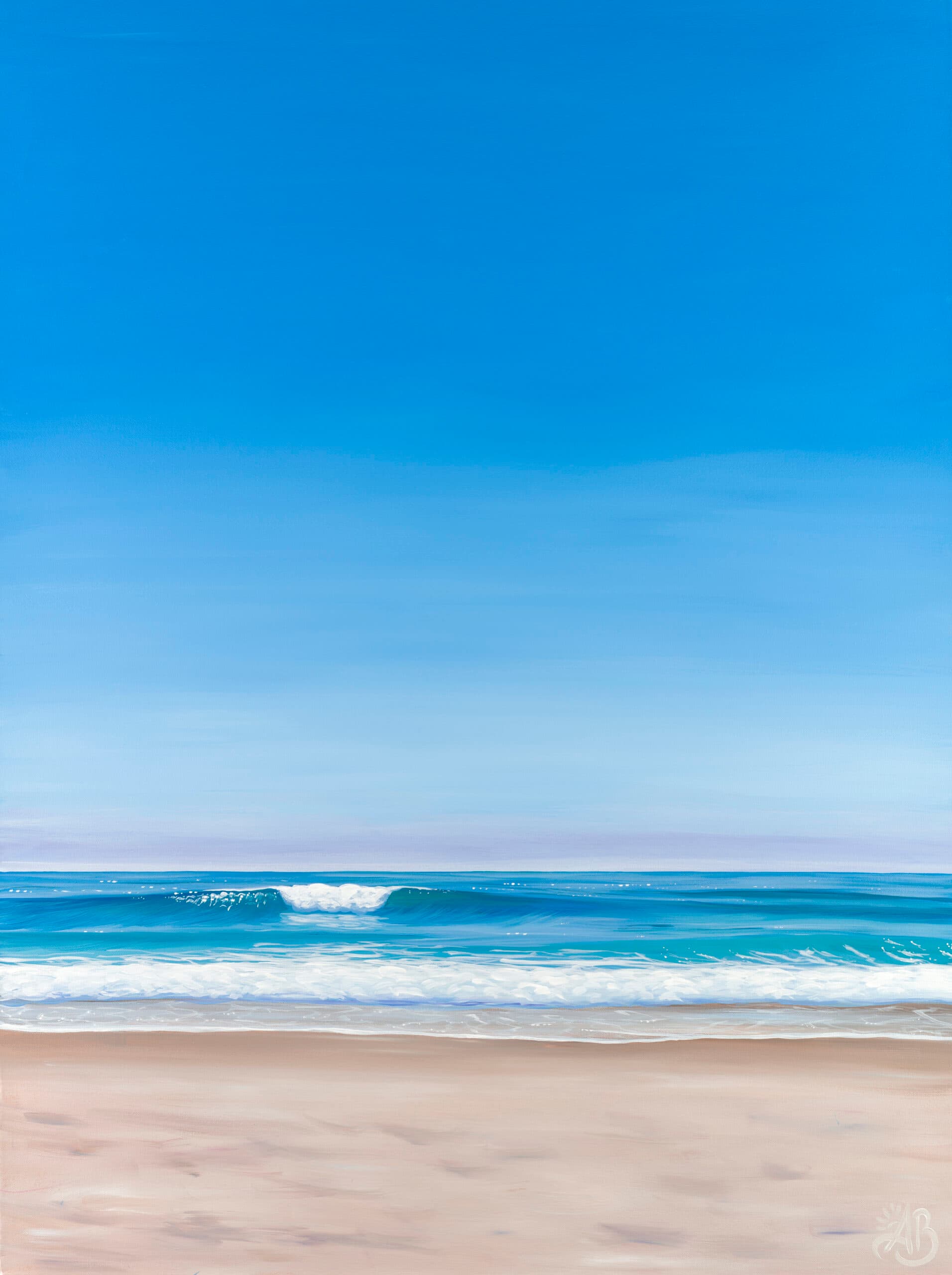 I am truly a child of summer, always relishing the long days and warm weather, and this piece encapsulates my ideal day: sun shining, warm sand underfoot, gentle waves beckoning a frolic. Simple, joyous. If I could, I would spend hours in this painting everyday, surfing the fun-sized waves and sunbathing. It is a simple piece, and the last one I created in the series. Sometimes I feel a pressure to create complex compositions, full of detail and elements. It felt bold to create a few paintings that were filled with so much sky, as if taking an easy way out painting half of my canvas blue. (It was actually not easy to paint a smooth gradient on this scale with acrylic paint, I was surprised to learn!) But, I also love the simplicity of some scenes where water meets sky, and think they tend to have a tranquil and grounding mood. Life is all about the simple moments, after all.