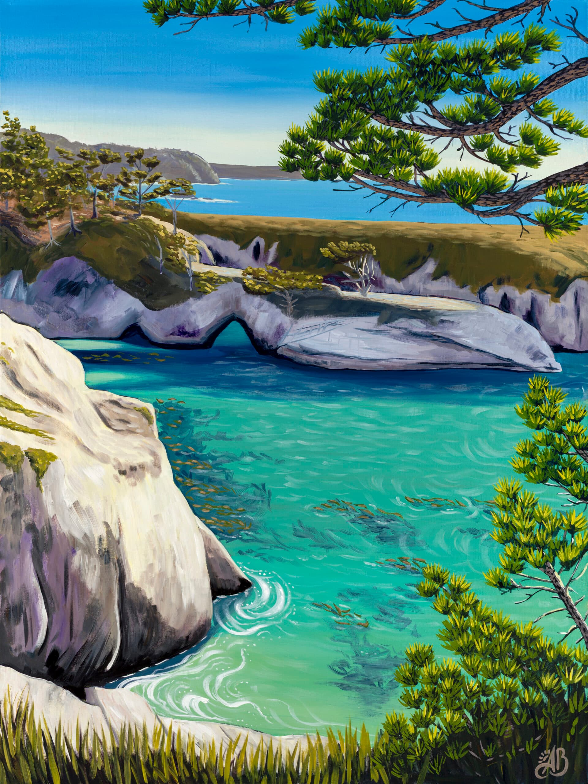 Speaking of memories, this painting of China Cove in Point Lobos was inspired by an adventure with my mom, who lives on the East Coast and doesn’t make it over here very often. I loved having the opportunity to share the beauty of this coastline with her. China Cove is one of those iconic views that is often painted, for obvious reasons. The color of the water is so strikingly vibrant and the elements of rock, water, and foliage dance together harmoniously. This painting challenged me with its various elements, and I was able to explore new techniques and tricks through my layered painting approach. I’m most proud of the water, finally getting close to capturing kelp fronds underwater, finding the perfect color blend for the hue of the water, and adding light reflections to create texture, too!