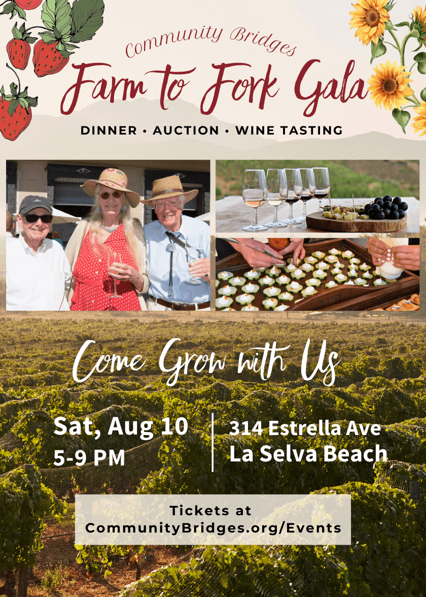 Community Bridges has been delivering essential services throughout Santa Cruz County since 1977. Ten programs provide education, counseling, nutrition, transportation and more to 20,000 local residents annually. The agency’s Farm to Fork Gala will be held at La Selva Beach Clubhouse on Saturday, August 10, 2024 from 5pm to 9pm.